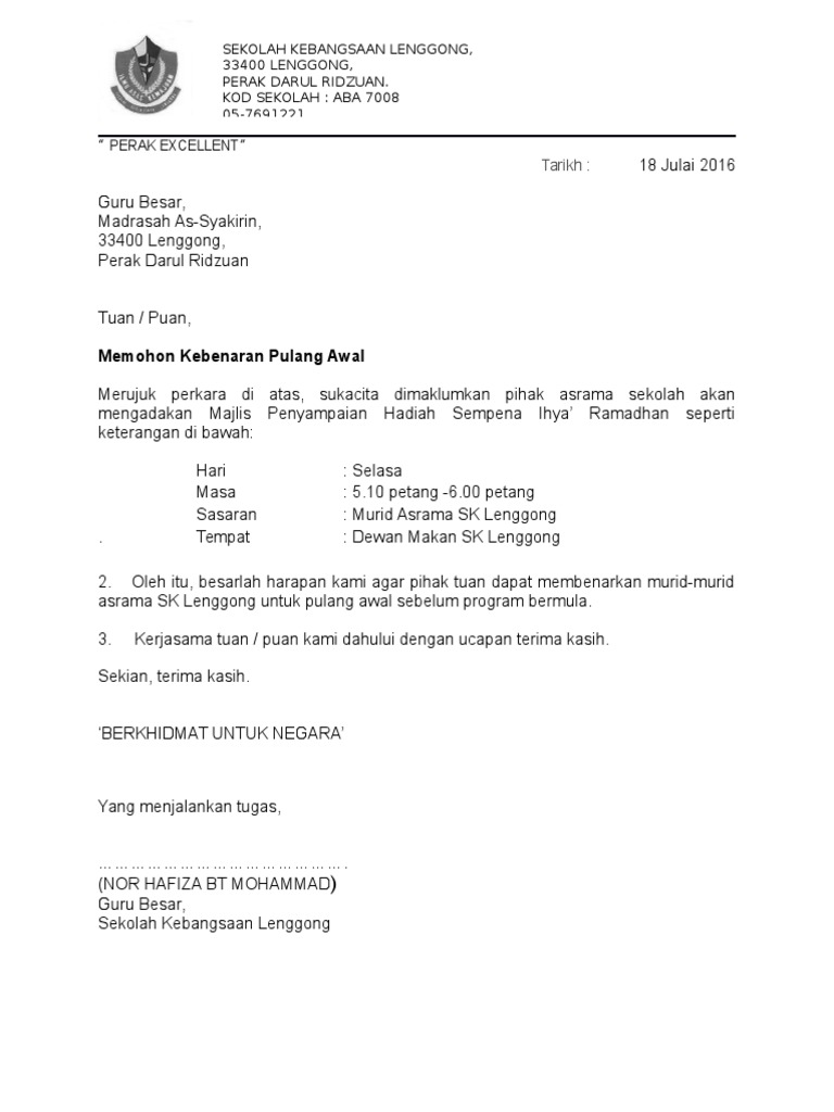 Selain itu ia akan memudahkan pengkaji mendapatkan kerjasama mudah dari pihak. Rujuk lampiran surat siaran dibawah untuk maklumat lanjut. Contoh surat izin pulang lebih awal dari sekolah.
